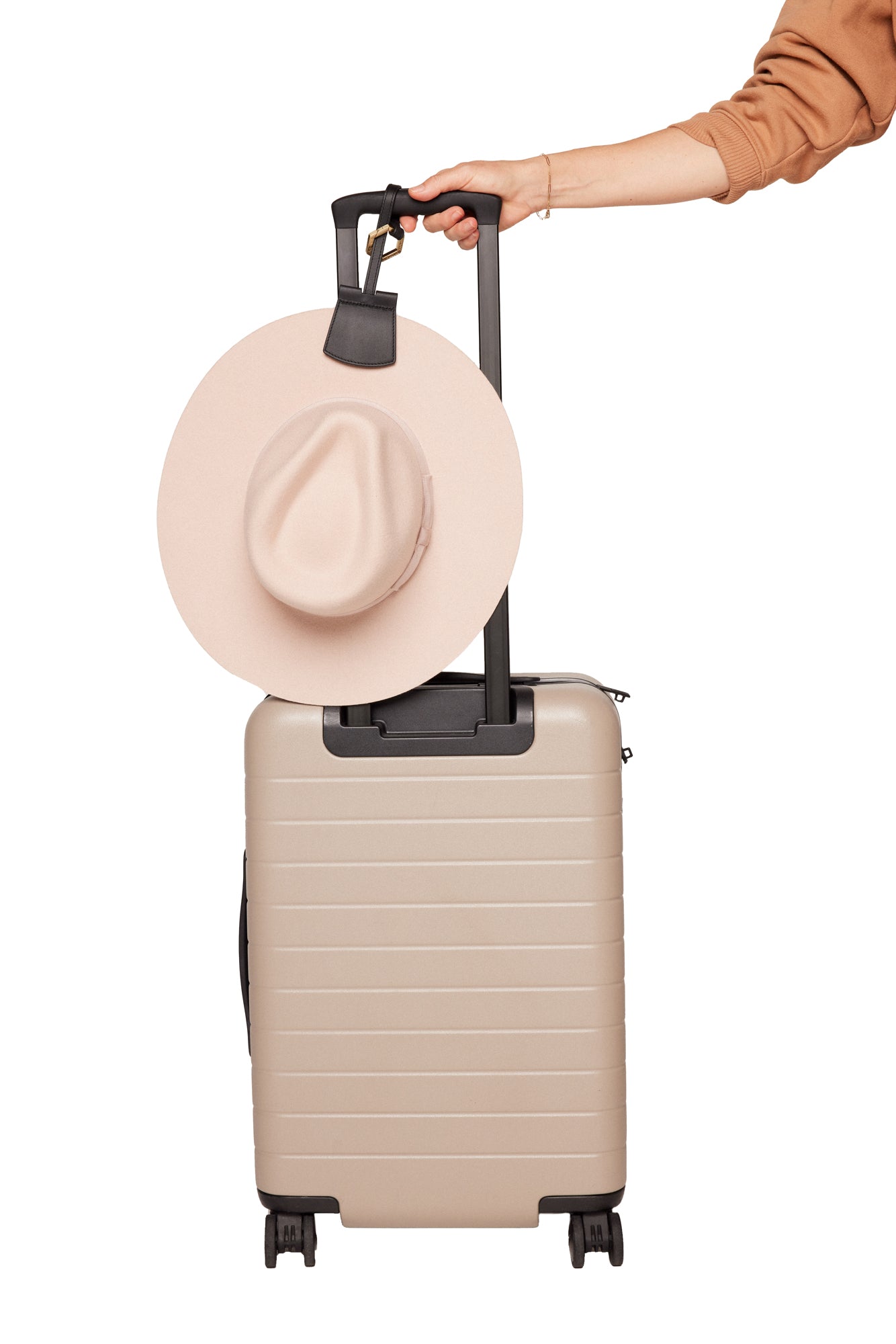 Our newest addition to the TOPTOTE hat clip fam, The Wrap! This new design was created so you can effortlessly loop it around any bag, luggage or handbag strap. Even loop it around your suitcase trolley, stroller or bike handle when you need a place to securely hang your hat. This versatile accessory ensures your hat stays secure and not smooshed wherever your adventures take you. Designed in smooth black genuine leather with brushed gold hardware so it is gender neutral and appeals to all types of style sensibilities.